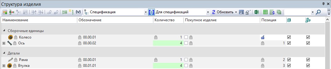 Для сборочных документов структура изделия автоматически заполняется на основе данных составных частей сборки.