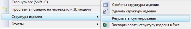 Пункт Структура изделия предоставляет быстрый доступ к некоторым командам из панели инструментов.