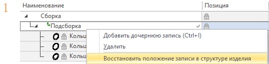Чтобы восстановить начальное положение такой записи, нужно выбрать пункт Восстановить положение записи в структуре изделия. После обновления структуры изделия, запись займёт своё исходное положение.
