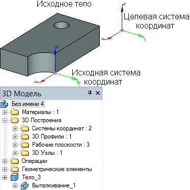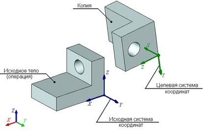 Параметры копирования определяются заданием двух ЛСК: исходной системы координат копирования и целевой. Преобразование осуществляется переносом исходной системы координат вместе со связанными с ней объектами копирования в положение, которое занимает целевая система координат.