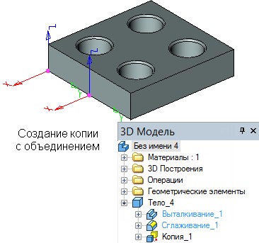 При создании 3D копии операций возможно автоматическое объединение созданной копии с исходной операцией, а также использование режима переноса (когда исходные тела при копировании удаляются).