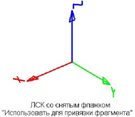 Однако не все ЛСК, созданные в документе 3D фрагмента, можно выбрать в качестве исходной системы координат фрагмента. В качестве исходной системы координат можно будет выбрать только те ЛСК, которые помечены как используемые для привязки фрагмента. Данный параметр задаётся в свойствах ЛСК при её создании или редактировании.