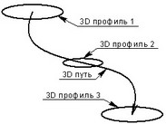 Вместо направляющих может быть использован один 3D путь, являющийся аналогом множества направляющих, проходящих через все точки сечений. Путь задаёт граничные условия для всей результирующей поверхности. Поэтому при задании направляющего пути другие граничные условия не задаются. Единственным исключением является возможность указать касательное направление к создаваемой поверхности по тому же пути в точке его пересечения с сечением, заданным 3D профилем (см. ниже). Данный путь не обязан иметь пересечения с сечениями. На приведенном ниже рисунке первая операция создана без использования пути и направляющих, вторая – с использованием 3D пути.
