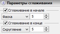 Сглаживание в начале. Установка данного параметра задает режим сглаживания рёбер исходной поверхности, то есть поверхности со стороны первого выбранного сечения. Сглаживание осуществляется методом Скругление или Фаска. Размер сглаживания задается в соседнем поле.
