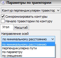 Выбор способа производится в окне свойств операции, в специальном поле с выпадающем списком. Выпадающий список содержит все три возможных варианта ориентации контура – «Контур перпендикулярен траектории», «Контур параллелен исходному», «По направляющим». Первое, и как показывает опыт, наиболее часто используемое значение, система предлагает по умолчанию. Так что если нужно ориентировать контур перпендикулярно пути, пункт по выбору способа ориентации контура можно пропустить.