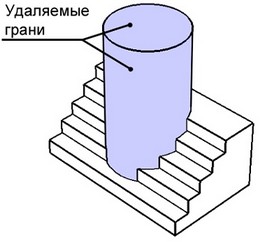 Работу этой опции можно продемонстрировать на примере отверстия с двумя фасками: удаляется поверхность отверстия и две фаски. В процессе работы команды грани отверстия удаляются, и образуются два цикла (верхний и нижний), ограничивающие получившуюся в теле пустоту.