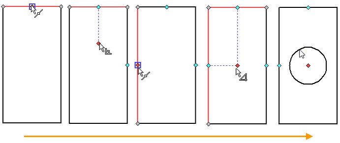 Когда чертёж достаточно сложный и построений много, чтобы активировать привязку к тем построениям, которые нам нужны, необходимо в режиме команды эскиз подвести курсор к тому элементу (или нескольким элементам), относительно которого мы хотим привязаться. Если на панели привязок активна нужная для нас привязка, то от элемента потянется пунктриная линия привязки. Далее ставим характерную точку при помощи
