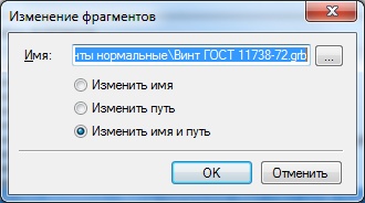 При установке параметра "Изменить имя" можно изменить только имя файла фрагмента, путь не изменится. При установке параметра "Изменить путь" меняется путь фрагмента, имя файла не изменится. При установке параметра "Изменить имя и путь" изменяются имя и путь для файла фрагмента.