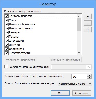 помогают быстро установить, снять и инвертировать пометку типов элементов. Заданный вариант настроек можно сохранить как именованную конфигурацию селектора. Для этого необходимо установить флажок "Сохранить как конфигурацию" и задать в соседнем поле имя новой конфигурации. Дополнительные параметры диалога настроек селектора - "Количество элементов в списке ближайших" и "Список ближайших в виде" позволяют задать способ отображения списка элементов, вызываемого из контекстного меню при выборе элемента (команда "Другой"). Нажатие кнопки [OK] приводит к сохранению заданных настроек и выходу из команды. Кнопка [Отмена] закрывает диалог команды без сохранения изменений.