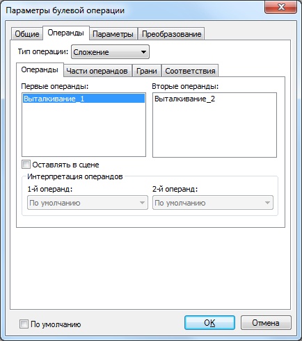 Содержание вспомогательной закладки – чаще всего она называется “Операция” – индивидуально для каждого типа 3D операций. У сложных операций с большим количеством параметров вместо одной закладки “Операция” может быть несколько вспомогательных закладок.