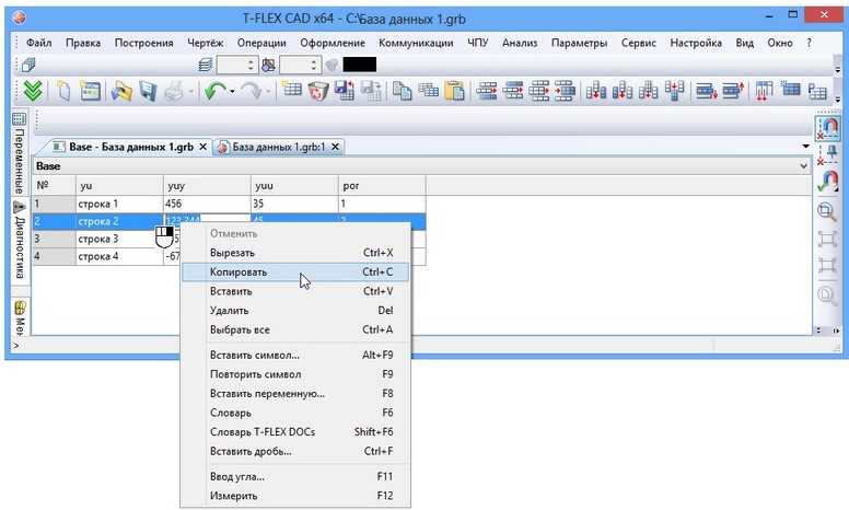 Для ускорения работы по заполнению таблицы базы данных можно использовать опции копирования/вставки. Копировать можно как содержимое отдельных ячеек, так и целые строки таблицы базы данных. Допускается копирование как внутри одной базы, так из одной базы данных в другую, даже находящуюся в другом документе T-FLEX CAD.