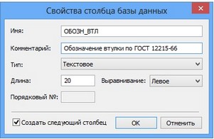 При установленном флаге “Создать следующий столбец” после ввода данных и нажатия [ОК] диалог свойств столбца появится снова, позволяя задать параметры следующего столбца, и т.д. При снятом флажке после закрытия окна диалога система перейдёт в режим заполнения базы данных.