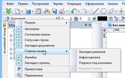 Этот флажок доступен в контекстном меню, вызываемом с помощью В том же контекстном меню доступен ещё один флажок, позволяющий управлять видом главной панели – “Закладки режимов”. Он управляет видимостью закладок на главной панели. Закладки позволяют быстро переключать наборы кнопок панели. Закладка активного набора помечается цветом. |