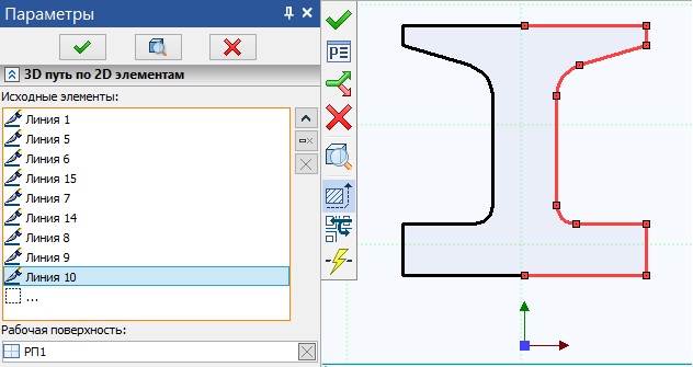 Переработаны опции создания 3D пути на основе 2D элементов, лежащих на рабочей плоскости. Опции создания 3D путей на основе штриховок и линий построения объединены в одну команду, и в дополнение к существующим ранее возможностям, добавлена возможность выбора линий изображения в качестве исходных элементов.