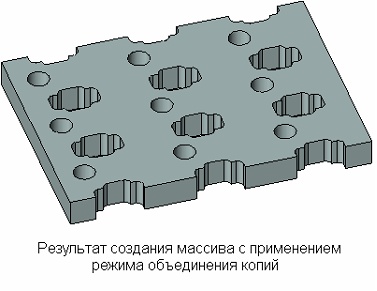 Массив граней. Этот тип массива позволяет выполнять размножение набора граней в пределах одного твердого или листового тела. Таким набором граней может являться отверстие, бобышка, канавка и т.д. Для выбора копируемых граней можно выбирать грани непосредственно или же выбирать элементы (рёбра, циклы), ограничивающие данный набор. Во втором случае система автоматически отбирает грани набора. К примеру, при копировании глухого отверстия любой сложности достаточно выбрать круговое ребро, ограничивающее его.