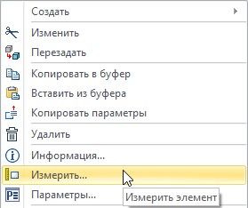 . В появившемся контекстном меню следует выбрать пункт "Измерить…". В результате будет запущена команда "Параметры|Измерить" в режиме измерения характеристик одного объекта. 2D или 3D объект, для которого было вызвано контекстное меню, автоматически выбирается для проведения измерений. Дальнейшие действия внутри команды полностью соответствуют описанным выше.