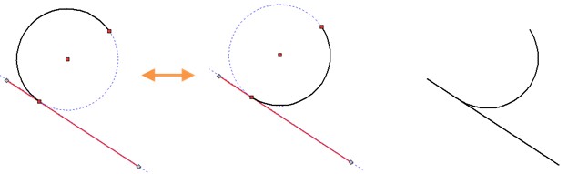 линию изображения, которую необходимо удлинить или укоротить. Выбранный элемент и возможные варианты его изменения подсветятся: если это дуга – то появится фиксированная окружность, если сплайн – то фиксированная линия сплайна. При этом сплайн при первом редактировании можно только укоротить, т.к. за линией сплайна положение точек не определено. Для удлинения сплайна существует специальная опция Смещение доступная при создании сплайна (описание данной опции дано в подразделе Параметры сплайнов) При выборе отрезка никаких дополнительных линий не появиться.