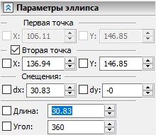 Список координат характерных точек и геометрических размеров в окне свойств также зависит и от этапа ввода значений. Например, при построении дуги, окно свойств при вводе координат первых двух точек - аналогично окну свойств отрезка, а при выборе третьей точки дуги - список значений меняется.