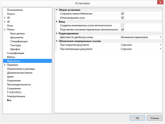 ●При открытии документа. Параметр определяет поведение системы при открытии 3D сборки (если обнаружено, что файлы фрагментов были изменены с момента сохранения сборки). Из списка можно выбрать следующие варианты: Обновлять - обновлять фрагменты, Не обновлять - не обновлять фрагменты, Спросить – при обнаружении изменённых фрагментов выдать запрос о дальнейших действиях. По умолчанию установлено Спросить.