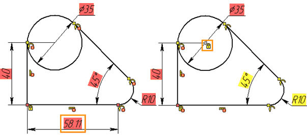 Быстро определить наличие или отсутствие степеней свободы у чертежа в целом можно по цвету фона управляющих размеров и цвету ограничений Совпадение.