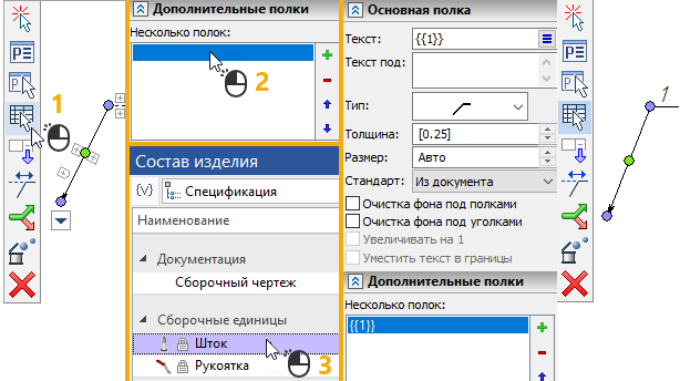 Вставка номера позиции. Команда используется для создания надписи, у которой в качестве текста основной полки задан номер позиции выбранного элемента. В остальном параметры создаваемой надписи задаются так же, как и при обычном использовании команды Надпись.