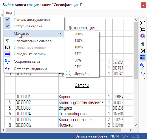 После вызова команды открывается специальное окно Выбор записи спецификации: