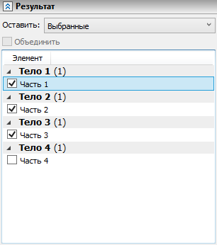 Рассечение с разделением окно параметров команды содержит вкладку Результат. При включенном динамическом просмотре в ней отображается список частей исходного тела, получающихся в результате рассечения. Части сгруппированы по телам, образующимся при создании операции (В режиме