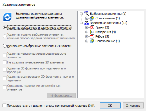 Если установить флаг Показывать этот диалог только при нажатой клавише Shift, то при следующих вызовах команды диалог Удаление элементов по умолчанию показываться не будет. Для его отображения при вызове команды придётся дополнительно нажимать <Shift>. Данный режим работы команды будет действовать до изменения пользователем состояния флажка или окончания текущего сеанса работы T-FLEX CAD.