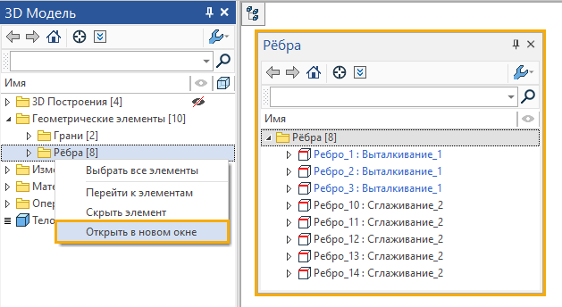 Команда Открыть в новом окне позволяет выносить любые элементы 3D модели в отдельное окно. Это окно можно перемещать по экрану. Оно сохраняет всю функциональность окна 3D Модель. Это окно позволяет избавиться от необходимости каждый раз перемещать курсор через весь экран, чтобы выбрать элемент дерева модели.