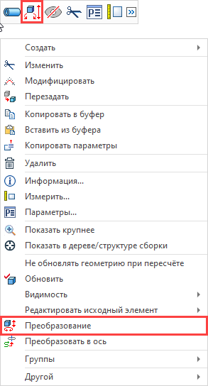 3D Модель > Дополнительно > Преобразования Сборка (3D) > Дополнительно > Преобразования Листовой металл (3D) > Дополнительно > Преобразования Поверхности > Дополнительно > Преобразования Сварка > Дополнительно > Преобразования Коммуникации > Дополнительно > Преобразования Примитив > Дополнительно > Преобразования Опорная геометрия > Дополнительно > Преобразования |