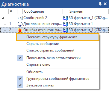 Более подробные сообщения обо всех ошибках отображаются в окне Диагностика. При выборе сообщения появляется контекстное меню. Если сообщение относится к 3D фрагменту первого уровня, то доступны все команды для работы с 3D фрагментом первого уровня. Если сообщение говорит об ошибке во вложенных фрагментах, то для работы с ними в контекстном меню доступна команда Показать структуру фрагмента.