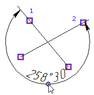 Воображаемые линии, заданные выбранными точками, делят плоскость на четверти. По умолчанию размер строится на основе произвольно выбранной четверти. При этом, когда курсор находится внутри этой четверти, размер показывает её угол, а когда курсор находится вне этой четверти, размер показывает суммарный угол остальных трёх четвертей.