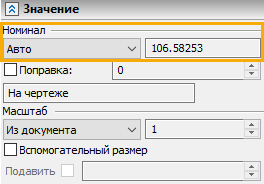 Данный параметр задаёт значение поправки, которая всегда будет прибавляться ко значению размера. Доступен только, если в выпадающем списке параметра Номинал выбраны варианты Авто, Вручную с поправками или По исходным линиям. В случае задания масштаба поправка прибавляется к уже отмасштабированному значению размерного числа. Значение поправки может быть как положительным, так и отрицательным. Значение можно ввести с клавиатуры или задать вещественной переменной.