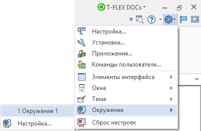 Окружение – сохранённый в реестре Windows набор настроек системы: видимость и состав панелей инструментов, специальных окон системы, окон библиотек и папок; настройки по умолчанию различных команд. Также в окружение могут включаться установки в различных окнах системы (редактор переменных, баз данных, и т.д.) и, как уже было сказано выше, все данные, задаваемые в командах Настройка и Установки системы.