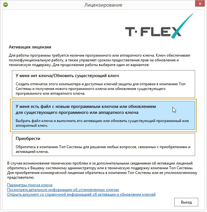 •Если у Вас есть программный ключ или аппаратный ключ (Sentinel HL версии 4.25 или выше, либо Guardant), и Вы желаете его обновить, то нужно воспользоваться командой Активировать лицензию, либо установить и запустить утилиту T-FLEX Лицензирование.