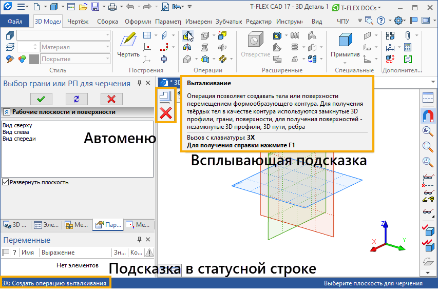 в 3D вне режима черчения на рабочей плоскости вызывает динамическую панель.
