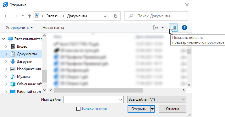 Поле в левой части диалога предназначено для быстрой навигации между папками. В правой части диалога отображается содержимое текущей папки. Если нажать кнопку Показать область предварительного просмотра, в правой части диалога будет также отображаться область предварительного просмотра выбранного в данный момент файла. Предварительный просмотр доступен только для тех файлов, у которых он включен в Параметрах документа.