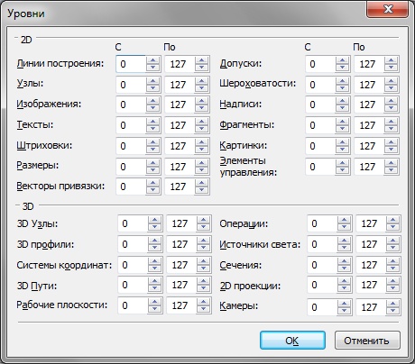 Как видно на рисунке, по умолчанию видимыми являются все элементы, уровень которых находится в диапазоне от 0 до 127. Если установить значения нижнего уровня для линий построения и узлов в значение 1, на чертеже станут невидимыми линии построения и узлы, поскольку они располагаются на уровне 0.