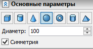 Для всех команд группы Примитив, кроме команды Пирамида, во вкладке Основные параметры окна Параметры доступен флаг Симметрия. При его установке создаётся единое тело примитива, состоящее из двух частей симметричных относительно плоскости XY, а исходная система координат примитива расположена в центре тела. При этом не применяются дополнительные операции симметрии.