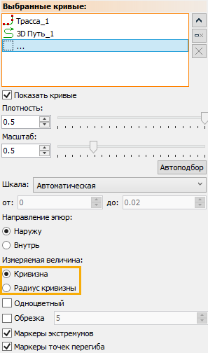 Метки сохранённых результатов измерения кривизны кривых будут отображаться во время редактирования исходных объектов (3D путей, Трасс).
