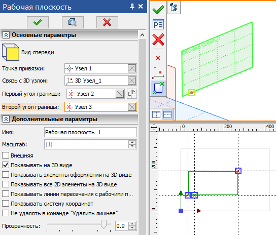 Также вы можете с помощью выбора двух 2D узлов (опции Первый/Второй угол границы) переопределить границы новой стандартной рабочей плоскости. По умолчанию границы рабочей плоскости определяются узлом, выбранным на первом шаге, и ближайшей из угловых точек границ чертежа (вид спереди - верхняя левая, вид снизу - нижняя левая, вид слева - верхняя правая).