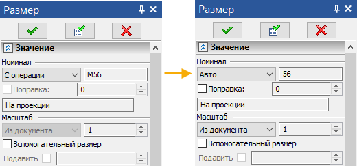 При простановке размеров по линиям резьбы автоматически проставляется обозначение резьбы. Для отмены этого режима (простановки обычного размера) необходимо в параметрах размера изменить значение параметра С операции на Авто (по умолчанию у размеров по линиям резьбы стоит С операции).